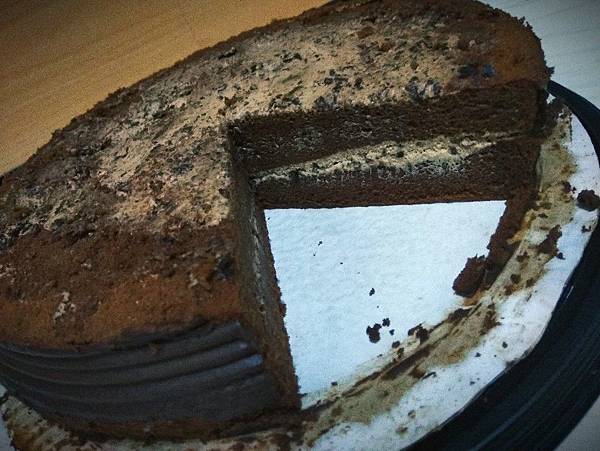 打開蛋糕盒就聞到香濃的巧克力氣息,濃、純、香,蛋糕體完全不甜,就是一般的巧克力蛋糕體並不很細膩,不過以499這麼大一個,還用到比利時黑巧克力,不很細膩可以接受而且是超值,表層的濃厚巧克力醬和奶油巧克力內餡比較甜