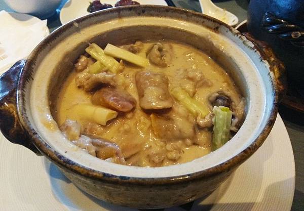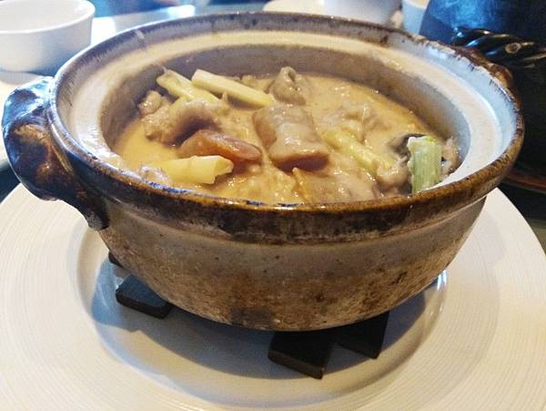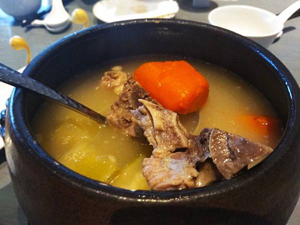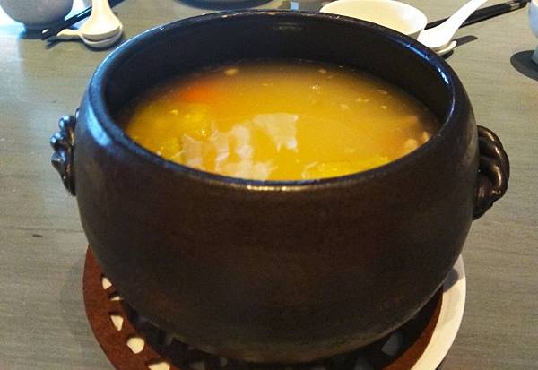 黑枸杞烏雞燉甲魚,甲魚若料理不好會有腥味,處理程序繁瑣營養價值高,滋補的效果好,深受港人喜愛,但台灣很少餐廳做這道湯品,烏雞更是女性補血佳品,黑枸杞營養價值更勝於一般枸杞,讓這道湯補上加補,做法是將已經多時熬燉的鮮湯中,放入烏骨雞、甲魚、胡椒粉、姜、蔥、酒,用小火慢燉至雞塊與甲魚質地軟透,約燉2-3小時,很期待的點了這道,但湯頭還不及老火例湯鮮美,一人份$380僅一小片碎甲魚+2塊烏骨雞的骨頭,味淡如水到不忍心拍,附上菜單上的圖片,實際無這些豐富的料,想品嚐滋補甲魚,到香港比較不會失望