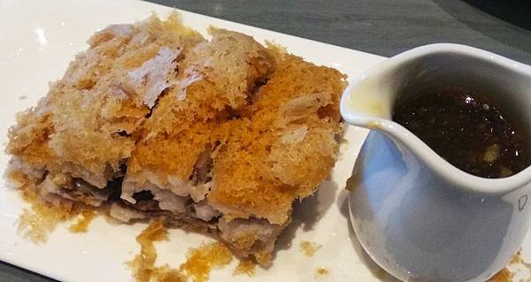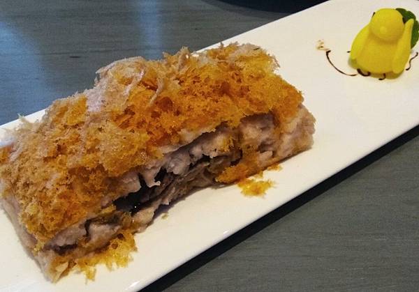 荔茸香酥鴨,必點的菜式,荔茸是指芋頭,夾在鴨肉中間,上面鋪上酥脆外衣,外酥內軟,先嚐一口原味