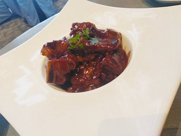 波特酒醬燒小排,豬小排沾粉油炸後,再用波特酒、紅糟、香料、陳醋滷汁燉煮而成,肉質軟嫩入味