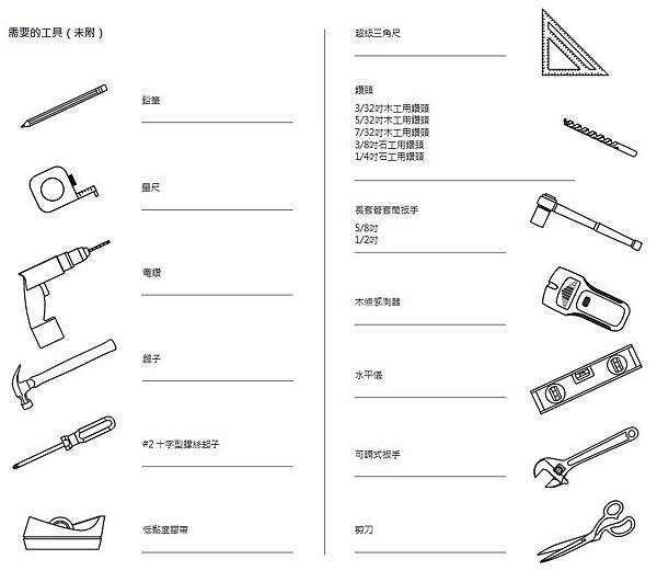 安裝部分和所需工具如下,剪刀是用來剪開外箱封條,安裝時不會用到,刨器是用來修舊門框的若就門框只需換色的也不會用到,附件的安裝說明步驟非常詳盡,有需要可以先下載研究 安裝說明書下載點我