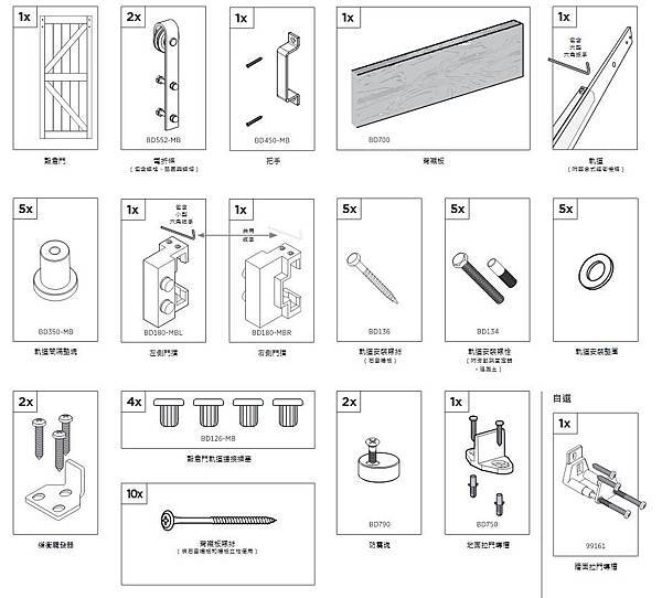 - 含門片、軌道、襯板以及安裝所需五金零件