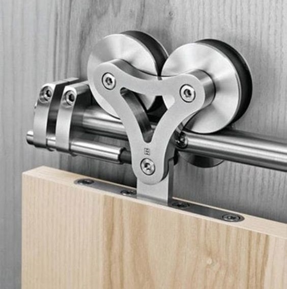 美式滑門最重要的是整套五金滑軌,滑門軌道五金承重安全性非常重要,若整扇門掉下來可是會出人命,五金是否堅固耐用是很重要的考量重點,門板只是質感和美觀考量,外型長一樣的五金則一分錢一分貨,看起來很像的五金材質有不鏽鋼製也有鐵製烤漆,鐵當然比不鏽鋼便宜很多,但是用一段時間後會生鏽,若銹在重要支撐結構上會非常危險,別只用價格為考量重點,畢竟滑門五金清一色都是大陸製,找好市多或有保障的大品牌買滑門居家會比較安心