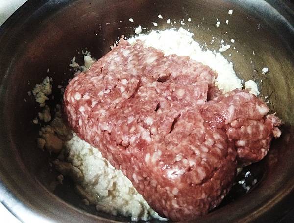 豆腐放入容器內→攪拌成細塊→倒入2/5和低脂絞肉→拌勻→+上述所有調味品