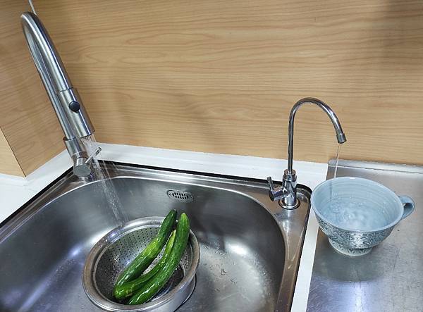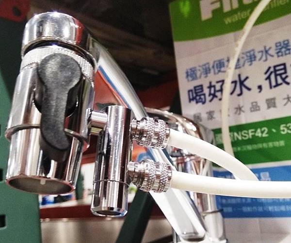 以廚房用淨水水龍頭來說尺寸算嬌小,這樣就不需使用接在水龍頭下的轉換開關,不需和舊水龍頭用同一個出水口,對水龍頭的選擇也不會受到限制,出水管在廚下防塵效果肯定比外露放在檯面好,2個水龍頭可以同時出水使用