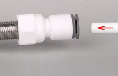 把連結頭鎖在水龍頭座上,再將pe管用力推到底,感覺再也推不了有卡住的感覺就對了