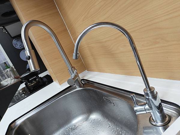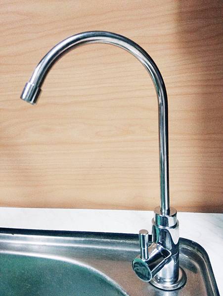 我的管洞是鑽在原有水龍頭的水槽另一側,感覺這樣使用上比較有彈性,有些人喜歡2個水龍頭裝在同一邊,但是使用時應該會互相干擾,接下來水龍頭鎖上去就安裝完成