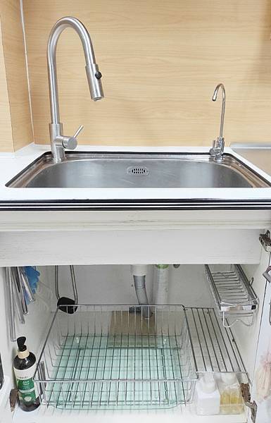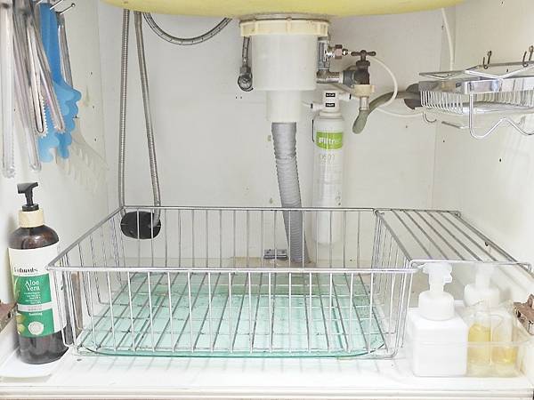 很多人習慣水龍頭櫥櫃下堆雜物,各式各樣清潔用的瓶瓶罐罐順手就會往裡放,日久容易塞好塞滿然後就成為蟑螂的度假中心,個人覺得很浪費這個順手使用的好位置,或許因為自己能修復水管所以習慣定期檢查,每隔幾天就會清潔廚下也會每晚除濕保持廚房乾躁,所以這個空間用來取代水槽上瀝水藍,暫放瀝乾當天用過的清潔後器皿,還滿方順手
