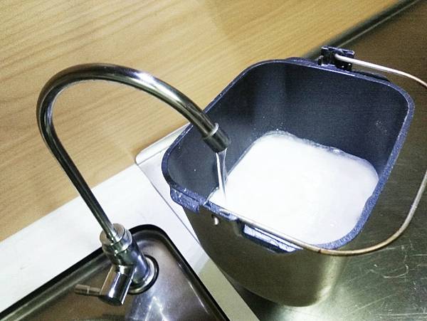 我家麵條都是自己做,用麵包機做麵糰時,容器直接放流理台接水,不用擔心放水槽接水盆底會弄濕而需要手拿著接,只可惜我家水壓很小,所以沒有開馬達時出水量會比一般人家庭的小。