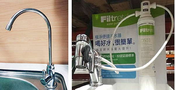 一個裝在檯上(左圖),一個裝在水龍頭出水口(右圖)濾心放在檯上、濾水管外露,相較之下改裝成廚下型顏質高多了