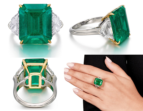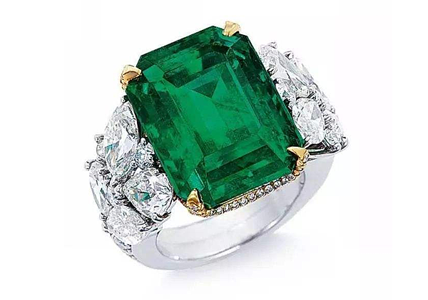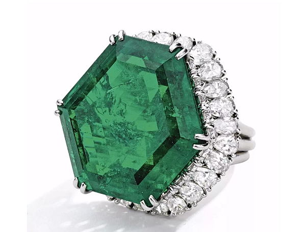 Harry Winston母綠戒指,估價:80萬-120萬美元,主石為一顆34.4ct的六角形切割祖母綠,產自哥倫比亞,周圍點綴總重6ct的水滴形切割鑽石。