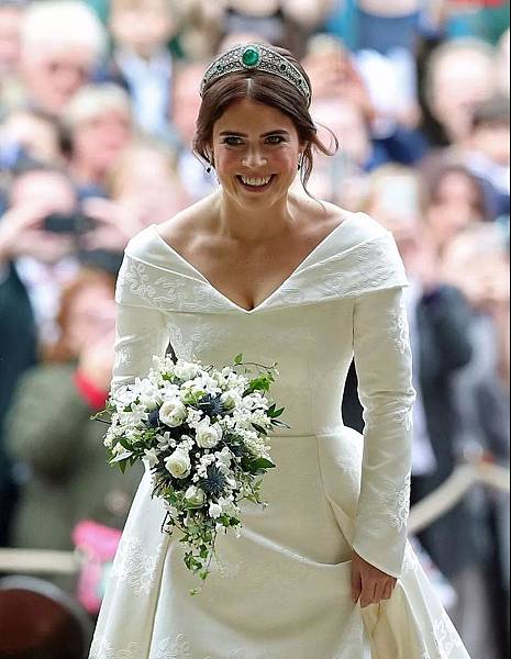 尤金妮公主天價祖母綠王冠,是從奶奶英國女王伊莉莎白二世那裡借來的;1921年由珠寶大牌寶詩龍用7顆祖母綠組成,鑲嵌在鑽石中,僅中心主石就重達93.70克拉。
