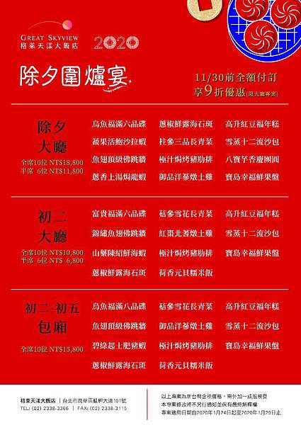 2.除夕夜(1/24)17:30進場,18:30準時開席。