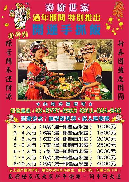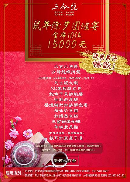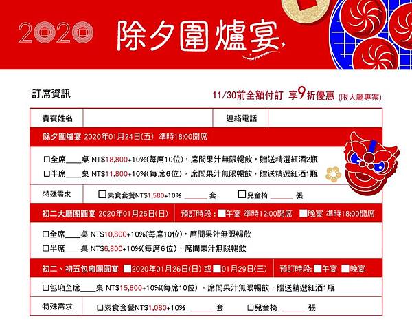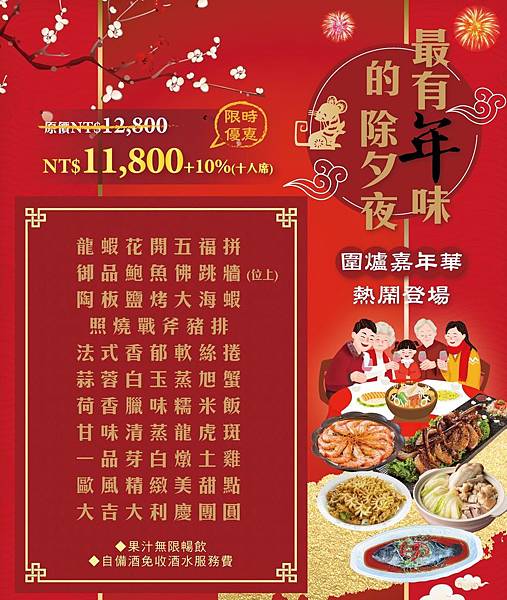 1.除夕圍爐需先訂位,並預付全額餐費。