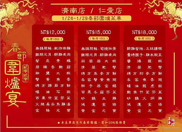 圍爐中式桌席 席設10位(1/24(五)晚間供應),每桌19,800元 ,每桌15,800元