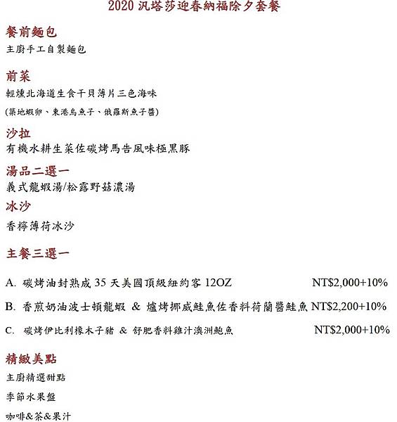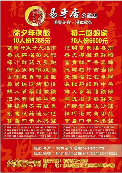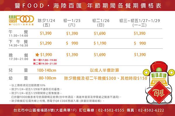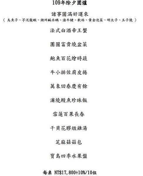 - 團圓餐費:NT$13,800+10%(10位)、NT$8,800+10%/(6位)