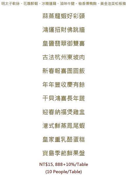 - 圍爐菜色:(11道)步步高陞、上品刺身拚鮮鮑、原盅三絲魚翅、XO醬扇貝海中寶、燒烤肋排、蒜蓉旭蟹糯米飯、蠔皇花膠烏參段、翡翠韭菜餃、山藥人參燉雞鍋、清蒸石斑魚、葡式蛋塔、吉祥如意、果汁暢飲