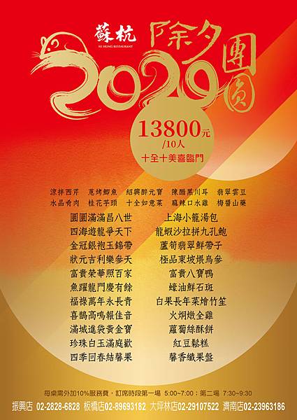 圍爐時間: 2020/01/24 (五)開放入席 17:00    開席時間 18:00