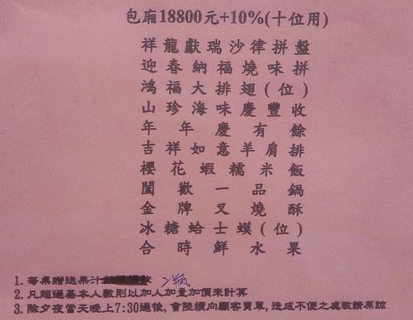 *每桌合10位用,另酌收一成服務費,如遇貨物短缺,本餐廳保有更改權利,依當日進貨為主,謝絕自備飲料,啤酒,水。 *除夕&初二當天全店皆”不收開瓶費(每桌200)〞,但恕不提供紅酒杯。