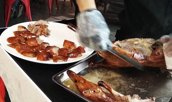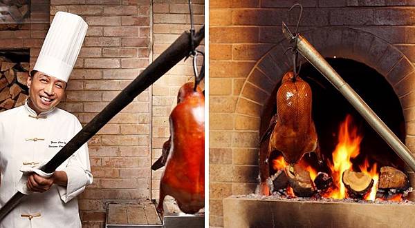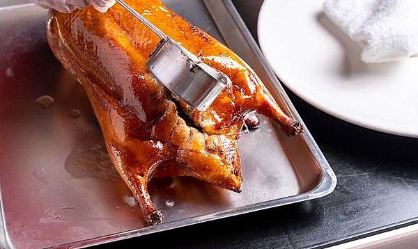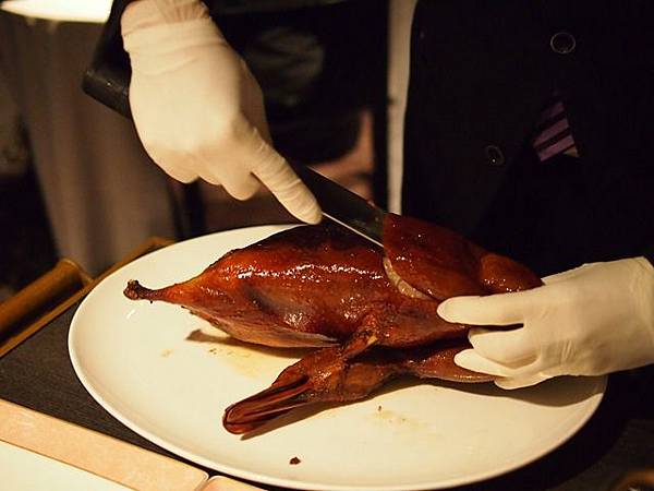 櫻桃片皮鴨上桌時,廚師會將烤鴨推到桌邊