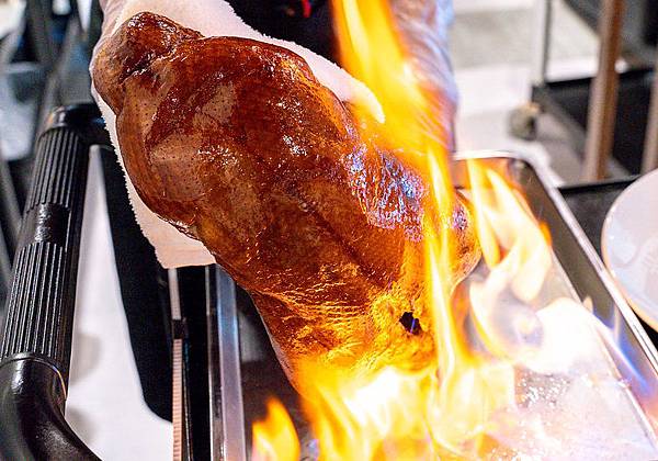 仿造米其林3星君品酒店烤鴨做法,在鴨身均勻淋上君度橙酒後,點燃火餡