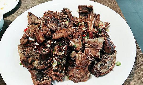 櫻桃片皮鴨餘下的鴨架,可以依照喜好選擇料理方式,各家烤鴨餐廳都是如此,我們選了最傳統的炒鴨架,我們的套餐,鴨架可以選2種吃法,但我們眼睛大肚皮小,所以只選一種,一隻全鴨的鴨骨炒起來是這麼大盤,帶一點點辣度,沒有很入味,這道我們直接打包,回家後,自己加了花椒熟油、辣椒再爆炒過,香氣逼人,是一款超級無敵的下酒菜