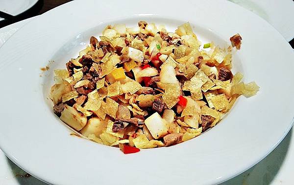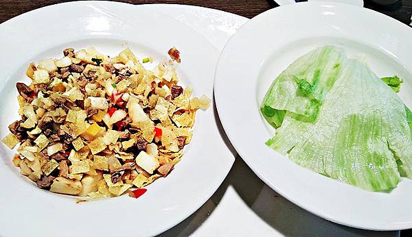 生菜櫻桃鴨松,用餅皮切成四方小塊油炸後拌炒在其中,所以吃起來又皮又韌,完全不入味的味道感覺滿失誤