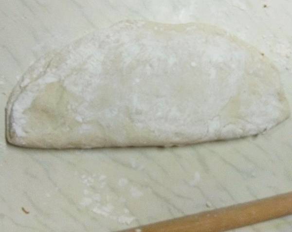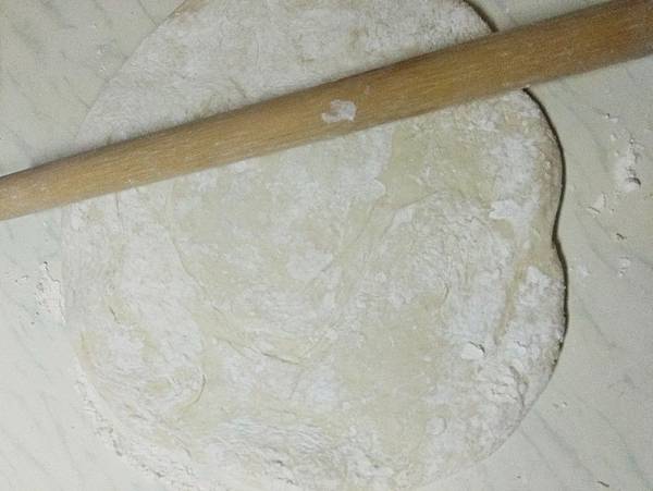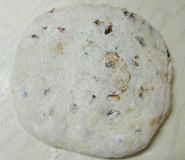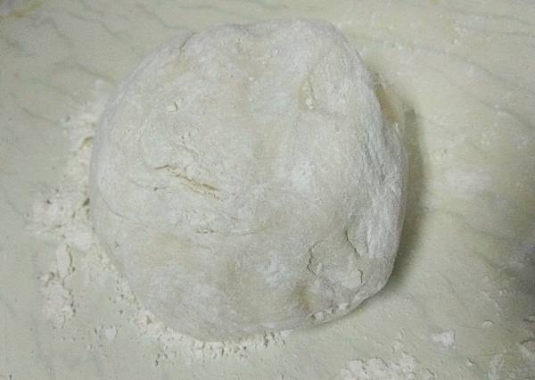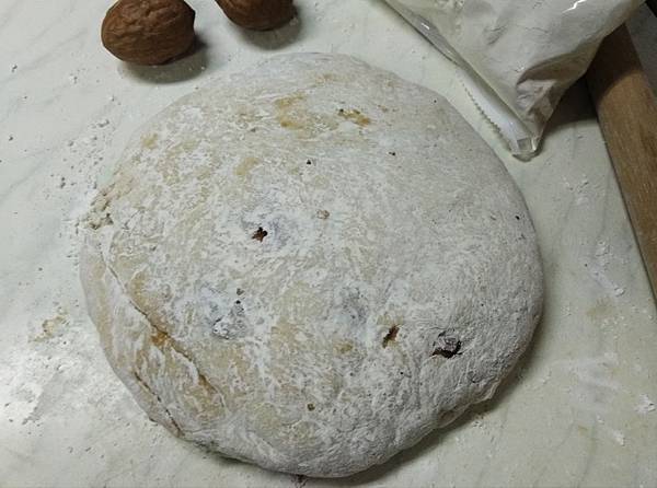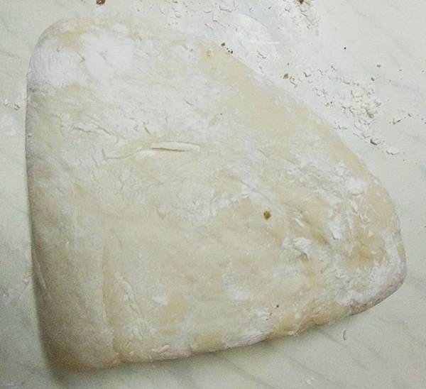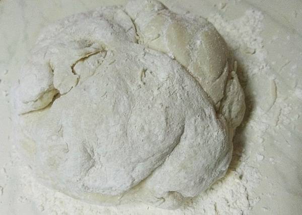3.桌面灑一點麵粉,取出用麵包機揉好的麵糰,此時麵團會塌下去