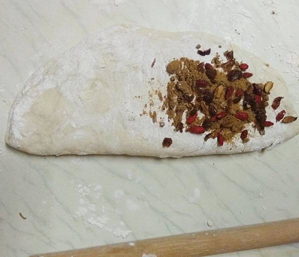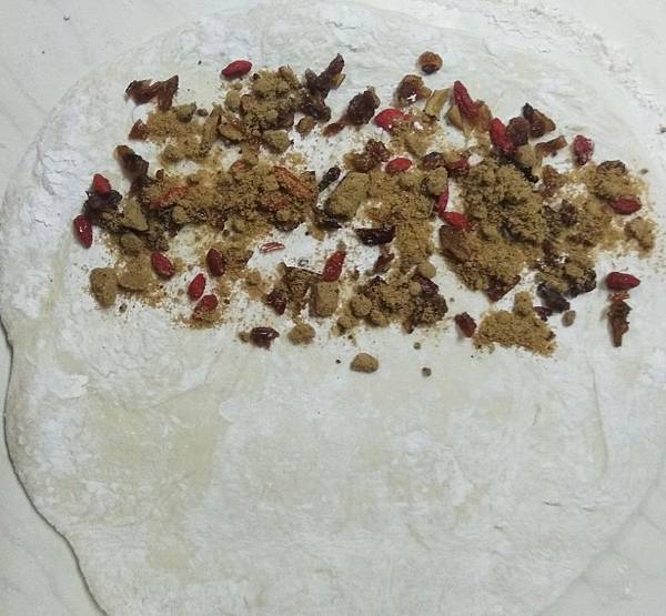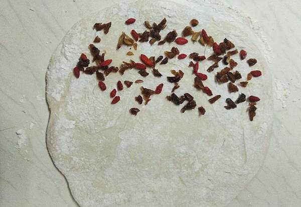 2.發麵時備餡料→桂圓乾、紅棗,洗淨後都剪成小塊狀,枸杞子洗乾淨,阿拿達常說我任何料理用的餡料太超豪邁,2種加起來大約1/2飯碗,真的滿多,給自己家人吃的,喜歡多少就加多少,加很多桂圓超香,我喜歡桂圓的香氣佈滿整個麵餅