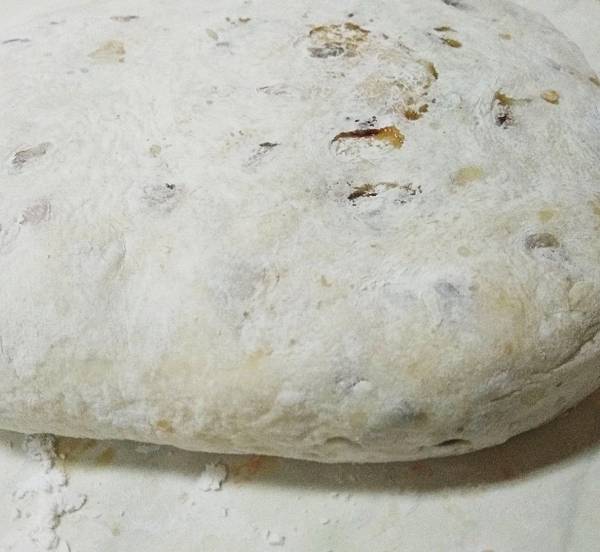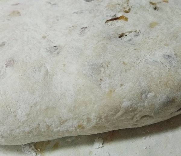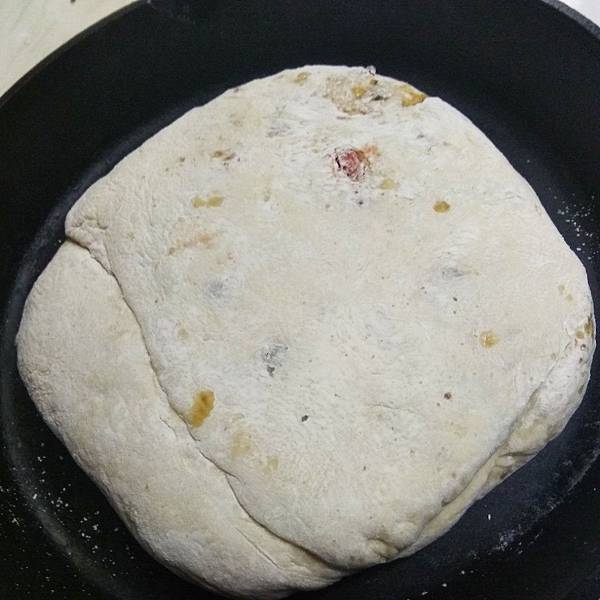 10.再重複2-4次,喜歡多層一點的感覺,就多折幾次,越多層上面鋪的料每一層要平均少一點,才不容易因為餡料多爆開,最後塑成圓形或方型,放進鑄鐵鍋中,讓麵糰再次發酵,比原來的大小,大1/4
