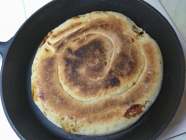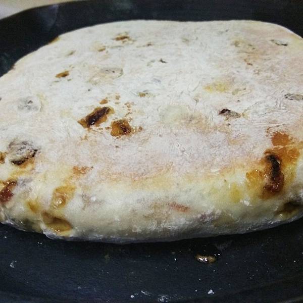 我的婆婆是烤山東大餅高手,但是用手工發麵、揉麵這麼大一個,非常費力,婆婆年紀越來越大,做的機率越來越小,所以久久才能吃到一次,寶貝說好想吃奶奶的山東烤餅,媽咪秉持一貫有求必應,努力學會這絕活,讓婆婆的好手藝延續下去,也能讓寶貝大滿足,又大又厚的麵餅,看起來真的好過癮,完全不用油,加了桂圓乾、紅棗、枸杞子,滿健康養生,剛烤好時外脆內軟,非常好吃,當媽咪前連煎蛋都不會的我,當媽咪後真是18般武藝都要會一點,我想這就是愛的力量吧!!