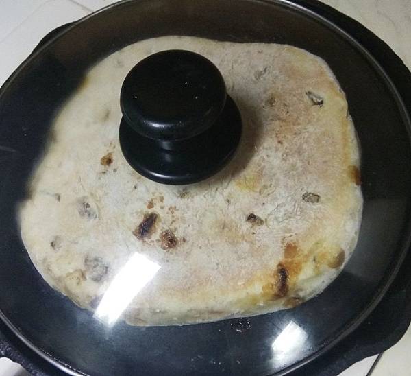 15.蓋上鍋蓋繼續炕,此時麵糰厚度已經定型,不會再發胖