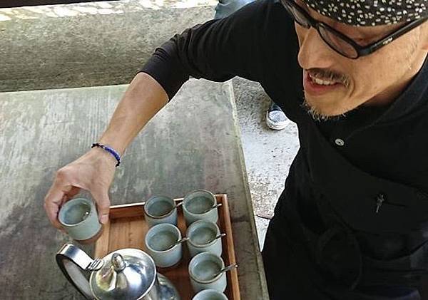 在桌邊打開鍋蓋,用竹製飯匙先拌一下熱呼呼的米飯,讓空氣進入增加Q度,同時也讓用餐者品味桂花米所散出的香氣,再示範製作一碗茶泡飯。