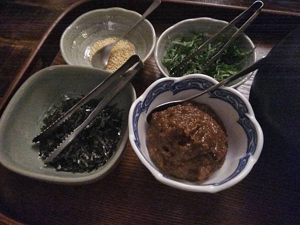 配料:發酵4年的梅干味噌、日本青紫蘇、海苔絲、白芝麻,這道我家常備,藏仙庵的茶湯用的比較清淡,因為要凸顯配料,我家的配料是海苔絲、白芝麻、柚子味噌,茶湯是日月潭紅茶+阿里山烏龍茶,香氣比較濃郁