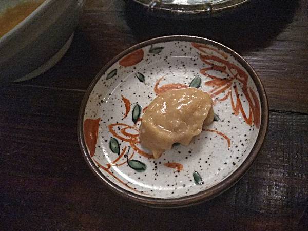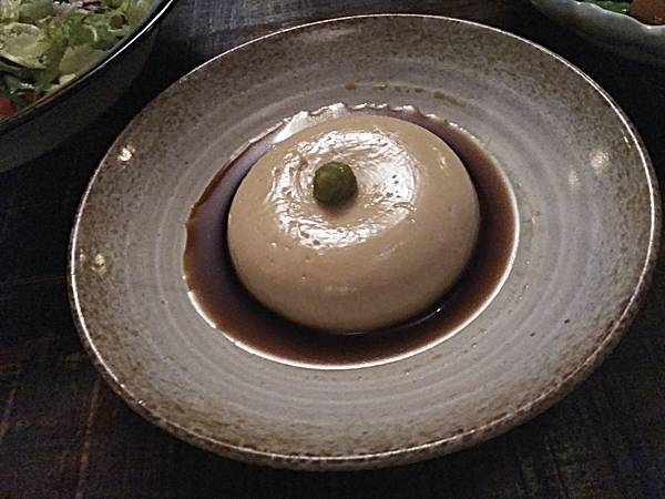 胡麻豆腐。白芝麻加葛粉所製,加米麴二次發酵的麴醬油,有點像是香港的老抽,新鮮山葵醬讓味覺層次更提升,寶明建議試試看用麴醬油拌一口白飯吃,果然香氣濃郁卻很爽口,胡麻豆腐口感不像豆腐,像是軟版的麻糬,感覺比較適合淋上熱熱濃濃的黑糖醬,做為甜點應該很棒。