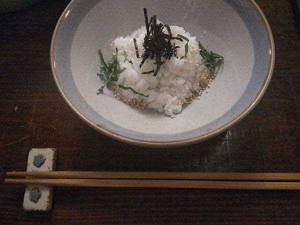 「不要一開始就全部攪在一起!」這是主人的叮嚀,要一小口米飯蘸著味噌吃,細嚼慢咽讓品味米飯Q 彈感,與四種配料不同味覺呈現的絕妙組合,越單純的食物,越能吃出本身的韻味,日本茶泡飯很厲害的地方,就是因為單純,所以能“專心吃飯”,咀嚼米的香與Q彈,搭配不同配料的香氣、味道,在口中層層散開,就會發現原來飯這麼好吃,如同修行一般,靜下來,就會發現很多過往忽略的事物,這就是生活禪。