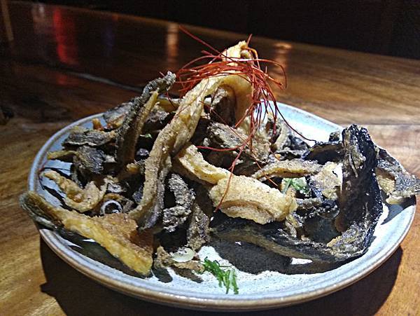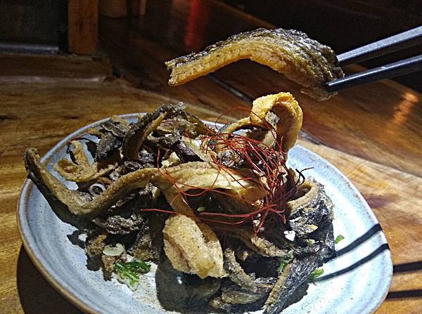 酥炸鰻魚鰭邊肉180元,香港炸魚皮已經很厲害了,這款新鮮現炸的鰭邊肉,熱呼呼上桌,咬下去卡滋卡滋,比香港的炸魚皮還優,吃一片酥炸魚皮,再喝一口冰涼袖子生啤,真是一大享受