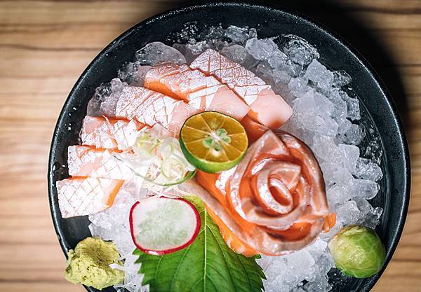 有各種生魚片,鮭魚腹肉360元,沾醬是師傅自己煮的醬油,回甘不死鹹