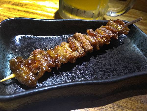 烤玉膚 一串 45元,外皮酥內軟嫩,香氣很夠,其實我不敢吃雞皮,但是這個可以接受,不過後來又來吃了2次,都不像第一次烤的外皮酥內軟嫩,是有點皮皮的感覺,之後就不想再點這道了
