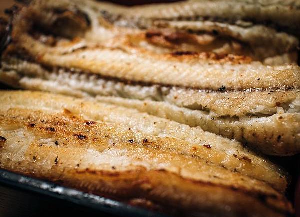 白烤鰻魚160元,肉質鮮美軟嫩,簡單的原味料理,外皮邊緣有一點焦脆,好香,原來完美的燒烤,烤焦的部分出盤前是先用利剪修掉燒焦處的,坐吧台好處是,又學到一招