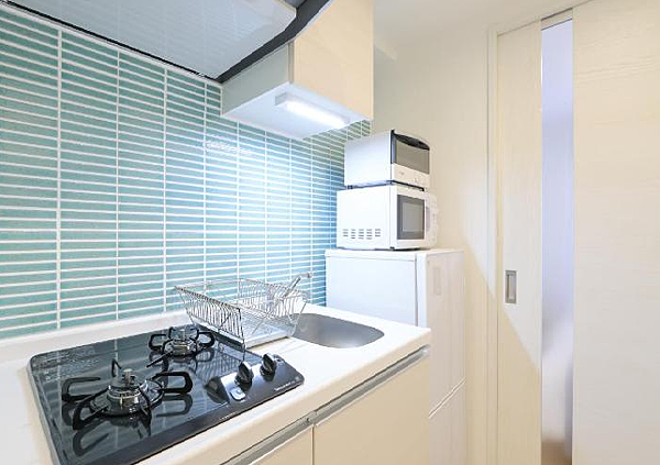 小廚房,抽油煙機、烤箱、微波爐、瓦斯爐、鍋具都有