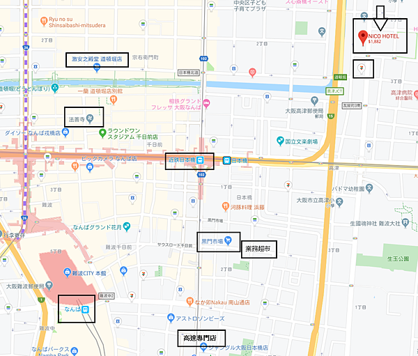 大國町Relif Hotel 離木津市場、大町站步行3分鐘,離難波站步行5分鐘,交通上是比NICO HOTEL方便一些, 超市有3間-LIFE、玉出、ODA,餐廳較知名的有無鐵砲拉麵,すき家牛丼連鎖店,くら寿司藏壽司、天下一品拉麵、吉野家、松屋、鳥貴族居酒屋、木津壽司-まるよし、魚市食堂、川上商店鰻魚飯。。。;便利商店4間-全家+sunkus+7-11、LAWSON100円店,周邊機能是比NICO HOTEL更好一些,地鐵站也比NICO HOTEL近
