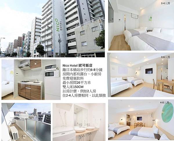 這間ニコホテルNico Hotel 妮可飯店,2019年中開幕,介於飯店和日租公寓間的新概念飯店,有點累似酒店式公寓,自由行住全新的飯店整體感很優,查過各大訂房網目前住客評價還不錯,坪數在寸土寸金的日本相對是大的,美中不足地點有點偏,離日本橋站步行約6-8分鐘,不算過度遠但也要走一段就是了,Nico Hotel 妮可飯店優點全新、有小廚房、最小房26平方米、洗衣機、陽台、平價,這個最小房型住2-4人皆算1房價格不因人數多價格變高,似乎是以房計價,一般飯店7歲以上就需算佔床費,這飯店的計價方式在日本很少見,不知是否因為是新開幕,雖無提供可攜式wifi熱點 Portable Wi-Fi hotspot,不過也滿適合精打細算的媽咪
