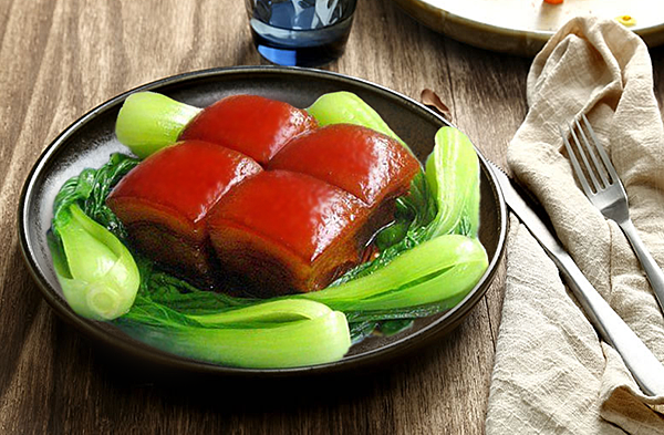 9.食用時容器內放入東坡肉+湯汁,放電鍋蒸,外鍋1杯水,跳起來悶30分鐘,就是入口即化的東坡肉,上桌前用小湯匙舀容器內的湯汁淋在肉塊最上方,讓湯汁自然滑落,整塊東坡肉看起來會更油亮可口,吃起來像現做的感覺