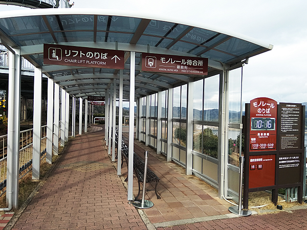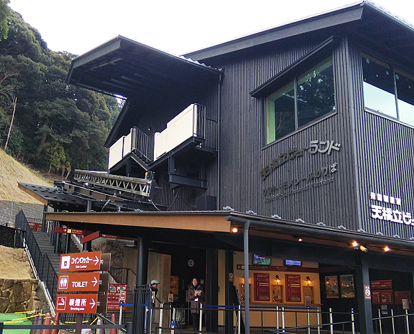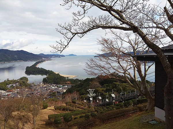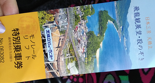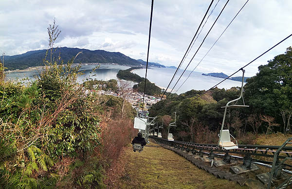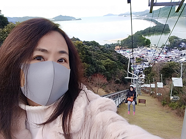 快到下車點前5分鐘,會稍作簡短扼要解說,不會打擾大家在車上補眠,雖然冬天很冷本日天橋立天氣很好有小小的陽光,空氣中充滿清新的感覺,大推搭單人吊軌纜車上山頂
