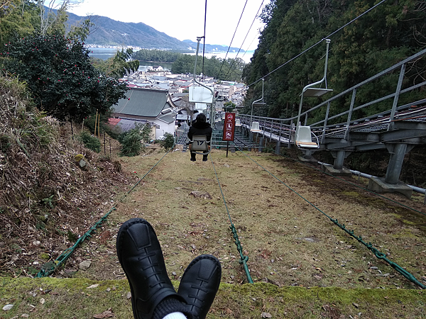 單人吊軌纜車離地面近很安全,坐上去後可以清楚看見天橋立360度景色,而且自己的腳丫一定會出現在照片中,缺席的冬雪~令人婉惜