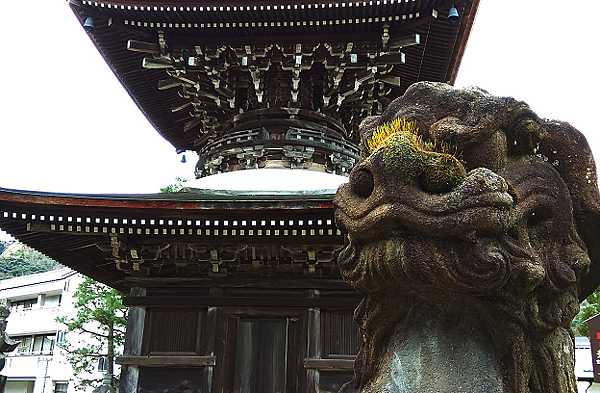 中院一對「獅子和狛犬」的組合,張嘴+無角 = 獅子。閉嘴+有角 = 狛犬,古代是搭配對守護神社或寺廟,後來兩者界線漸漸模糊,多數的角已消失一律稱為狛犬