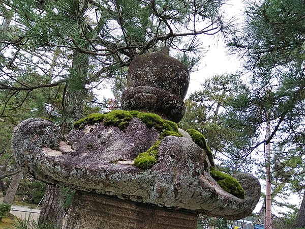 鼻頭上滿是青苔的狛犬,看起來像是在微笑