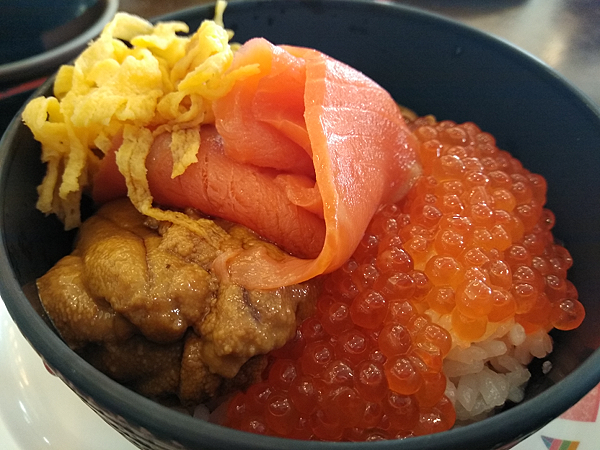 這家餐廳的海鮮基本上算新鮮,重點在生食部分,會自己調味就能變得好吃,如果只拿熟食那肯定會讓你失望,因為是大堆頭的自助式擺盤,乍看容易讓人失望,需要拿了食材後自己擺放精緻,我家阿拿達,把一碗普通的白飯上層先抹上一點點芥末和薄薄的醬油,上面再蓋上碩大晶亮的鮭魚卵、大片海膽、薰鮭魚片、金黃色的蛋絲,就變成這樣的豪華海鮮蓋飯,吃起來味道層次豐富,不輸給日本料理店的海鮮蓋飯,讓我不禁驚呼,結果坐在我們周圍的團員們一見到這碗海鮮蓋飯,瞬間消失,過不久回到座位上,人手一碗更豪華的海鮮蓋飯
