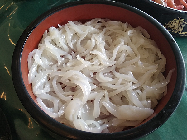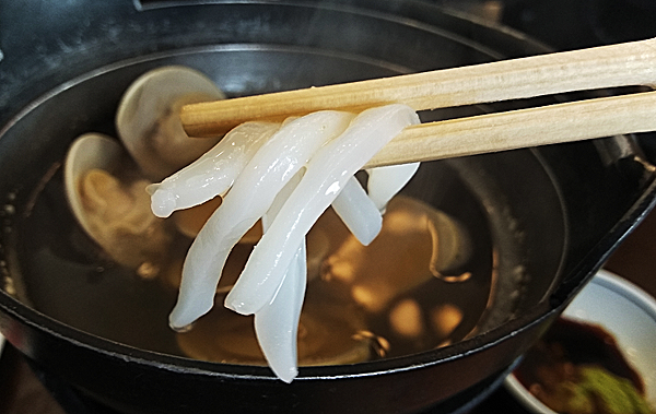 這款切得像粗麵條一樣的軟絲,阿拿達喜歡直接吃,他說非常有軟且彈性,我不敢生食,則是在滾燙的火鍋中川燙20秒,外熟內鮮,彈牙好吃,直接當100%軟絲麵條吃也不為過,相較之下手工魚麵已經不算什麼了